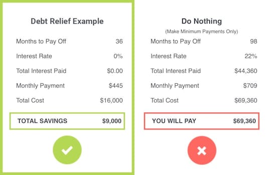 By getting the “Freedom Debt Relief Plan” your debt shrinks month after month and before you know it, you’re out of debt – significantly reducing the time you need to get rid of the debt. How do they do that? With the negotiating power of a few thousand people and billions in managed assets they get the credit card companies to agree to 1. lower interest rates, 2. waive penalties and 3. waive late fees as they much rather take a smaller piece of the pie than getting nothing from consumers who default on debts or declare bankruptcy.